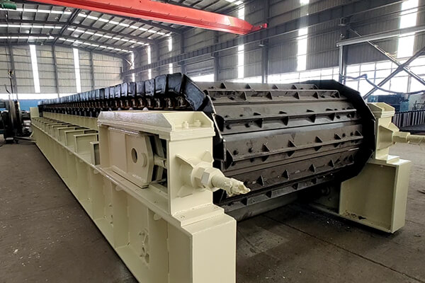 The chain plate device consists of slot plates, chain links and other parts. The slot plates are of single arc joint type and are welded with low alloy steel plates, which are of high strength, wear-resistant and leak-free. For the chain link type, a bulldozer track chain (tank chain) manufactured by a specialized manufacturer was selected. The chain link of this track chain has small pitch error, smooth movement, high strength, large tension and no lubrication. Rack